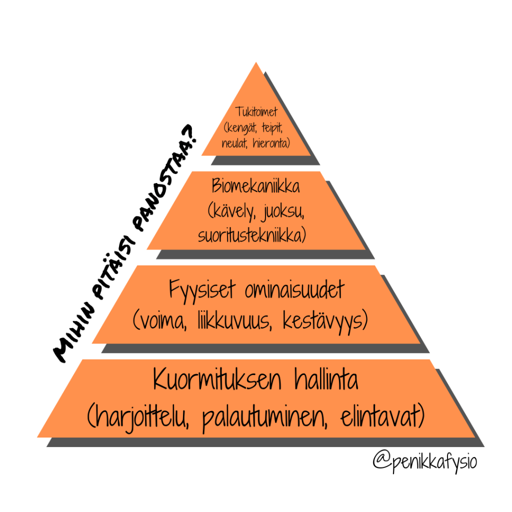 Kenkävalinta on tyypillisesti ylikorostettu tekijä kun puhutaan vammojen ehkäisystä tai hoidosta. Se on hierarkiassa vasta kirsikkana kakun päällä muiden vaikuttavampien tekijöiden jälkeen.